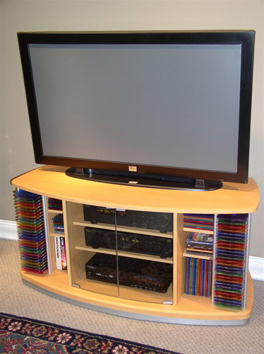 move your unloaded TV cart. Will hold most 42” television sets. Shaped vacuum formed shelves. Swing tempered doors keep the dust off your audio equipment. CD racks and shelving for your VCR or DVD player. Unit accented with silver metal CD racks and silver skirt. Ready to Assemble.
