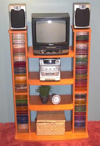 This quality entertainment center is designed to meet your storage needs for television and stereo systems as well as CD's, DVD's, videos and more! What makes this entertainment center unique is that is features two side towers that store up to 140 CD's. The rich cherry finish and stylishly rounded edges on the shelves and base of this entertainment tower give it a softer, more elegant appeal.
