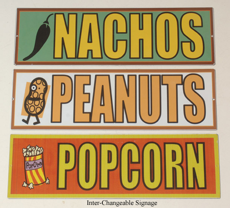 - Interchangeable signage for either Nacho Chips, Peanuts or Popcorn.