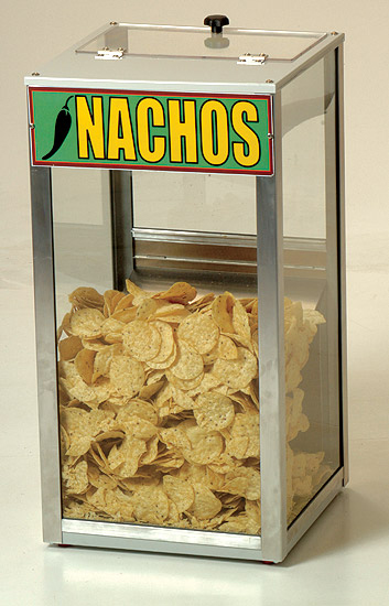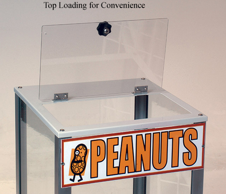 This versatile 100 quart Warmer/Merchandiser can be used for either Nacho Chips, Peanuts or Popcorn. The unique inter-changeable signage can transform this warmer to any of these products in just seconds. In addition the signage can be placed on the front or back of the unit to allow for front counter or back counter applications. This unit is top loaded with a deflection board to prevent product breakage. A 50 watt heating element in the base keeps the product warm and fresh.