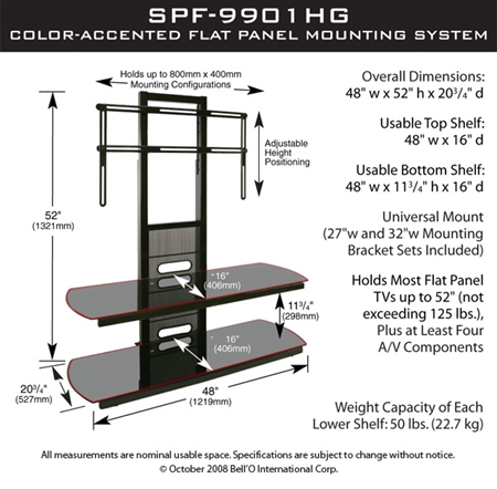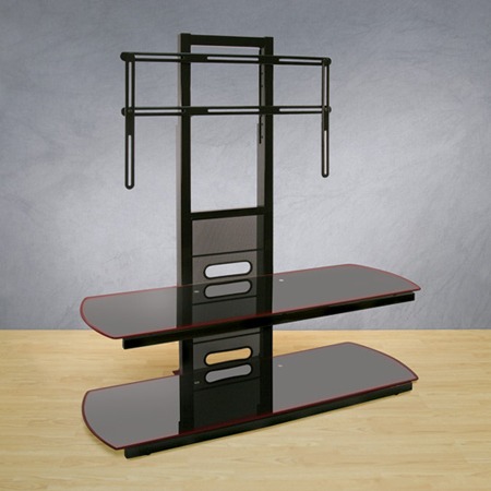 Sleek and beautiful with matching red accents, this Flat Panel Mounting System was designed to elegantly display today's hottest color-accented LCD and Plasma flat panel televisions (up to 52" or 125 lbs) with ease. The high gloss, scratch resistant black steel frame and black tempered safety glass can accommodate at least four A/V components. Includes an integrated CMS® Cable Management System to hide wires and interconnect cables. Simple assembly required with all necessary tools included.