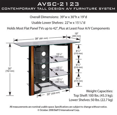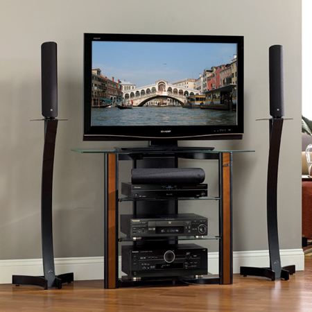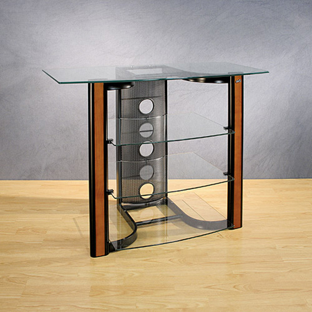 This taller audio video system is perfect for the bedroom or den. Inlaid with real wood in a Cherry finish, it is constructed with black scratch resistant, powder-coated steel and clear tempered safety glass. It accommodates most Flat Panel Plasma, DLP, or LCD TVs up to 42", plus at least 4 audio video components and a center channel speaker. An integrated CMS® Cable Management System hides unsightly wires and interconnect cables.