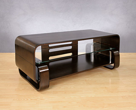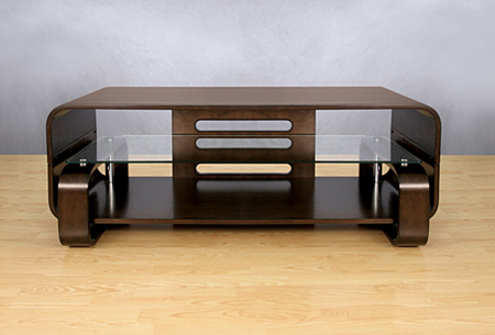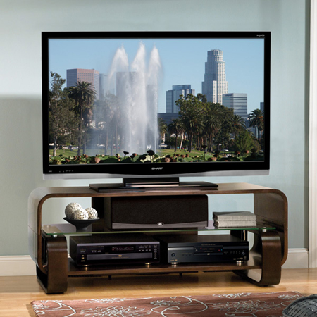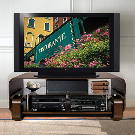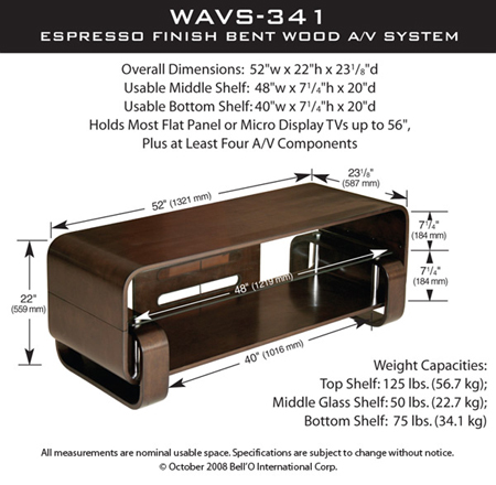 This bent wood Mid-Century design audio video cabinet with bent wood legs will accommodate most Flat Panel or Micro display TVs up to 56" plus up to 4 or more audio video components and a center channel speaker. The open design provides flow through ventilation and features a Bell’O® CMS® Cable Management System to hide wires and interconnect cables.