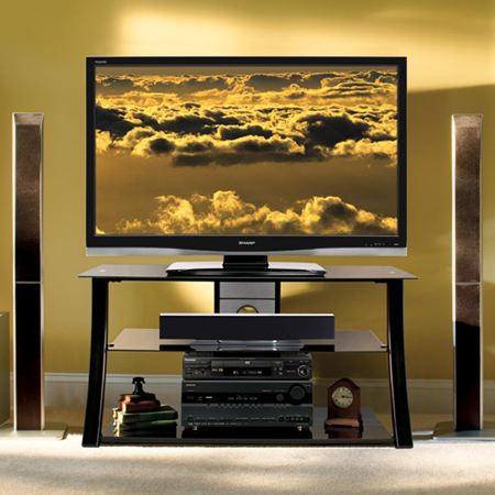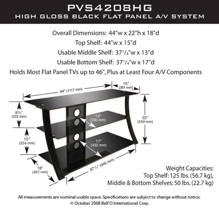 This contemporary audio video furniture with a scratch resistant high gloss black powder-coated steel frame and black tempered safety glass shelves is designed to hold most flat panel televisions up to 46" plus up to four or more audio video components plus a center channel speaker. The CMS® Cable Management System hides and organizes wires and the open architecture provides flow through ventilation.
