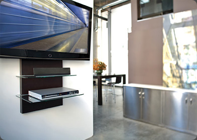A unique, stylish wall furniture system for mounting components below—or next to—flat panels.