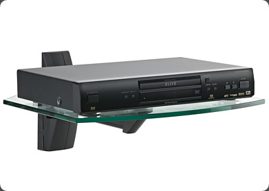 A commercial grade wall mounting component shelf Product Benefits * Double pivot system for maximum viewing angles * Black nylon stabilizing strap * Includes complete Grade 5 hardware kit * Wall plate hides bolts * Allows cable management Product Specifications * Supports up to: 30 lbs (13.6 kg) * Tilt: 0 to +15° * Tempered glass shelf: 10mm * Color: Black