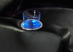 Lighted Cup Holder for Row One Theater Seating. A ring of LED lights illuminates the cup holder from the inside of the cup holder to provide a nice gentle glow. Brushed Nickel Finish