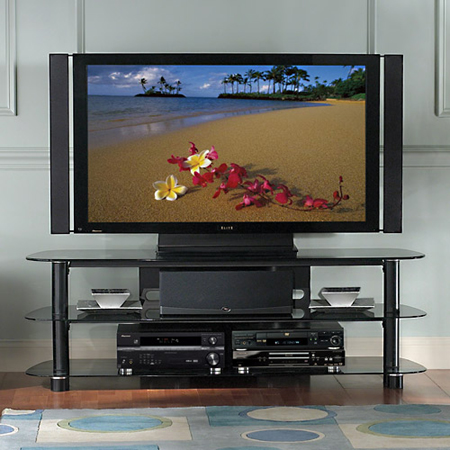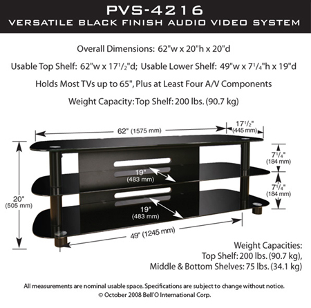 Long, low and lovely, this contemporary design constructed of deep black tempered safety glass, scratch resistant powder-coated metal and MDF will accommodate up to most 63" Flat Panel TVs, DLP or LCD Projection TVs or most Direct View TVs, plus up to 6 or more audio video components and a center channel speaker. It includes an integrated Bell'O® CMS® Cable Management System to hide wires and interconnect cables.